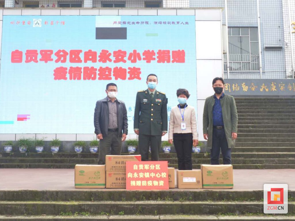 4月7日,自贡军分区刘新宇副司令带队,把口罩、酒精、消毒液和洗手液等防疫用品及时送到对口帮扶的学校——沿滩区永安镇中心学校,解决了学校防疫物资的燃眉之急。