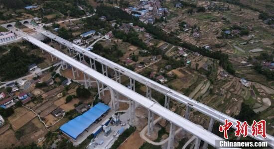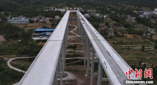 5月9日,四川荣县,成都宜宾高速公路五皇坝大桥即将进入路面施工阶段。(航拍图片)