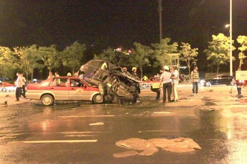 被现代吉普车压在出租车里的司机和乘客只受了轻伤,但现场并没有见到黑色现代越野车上的成员。