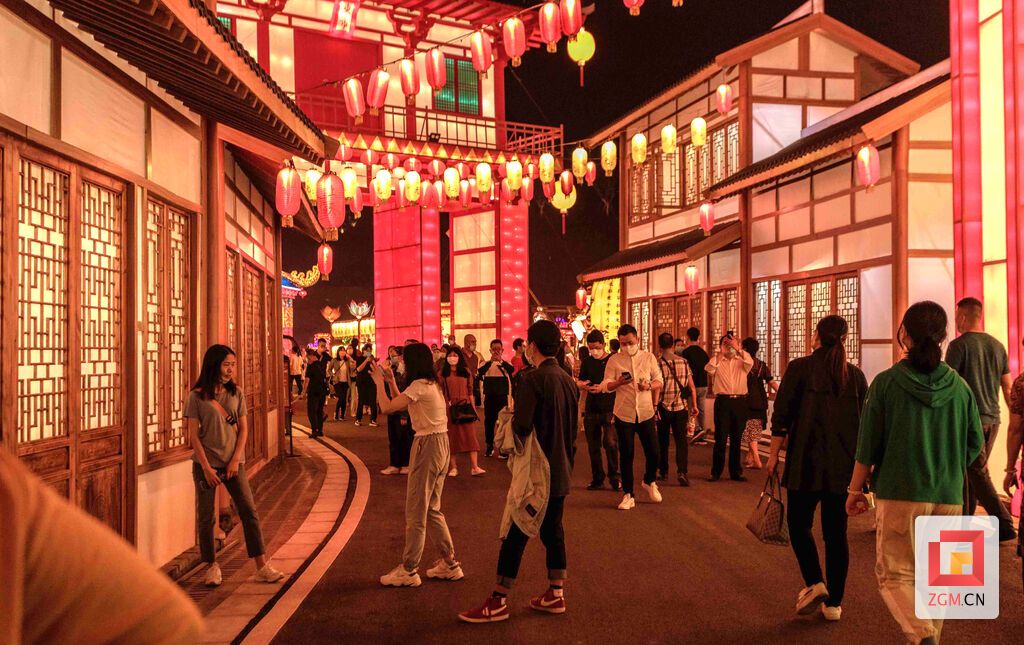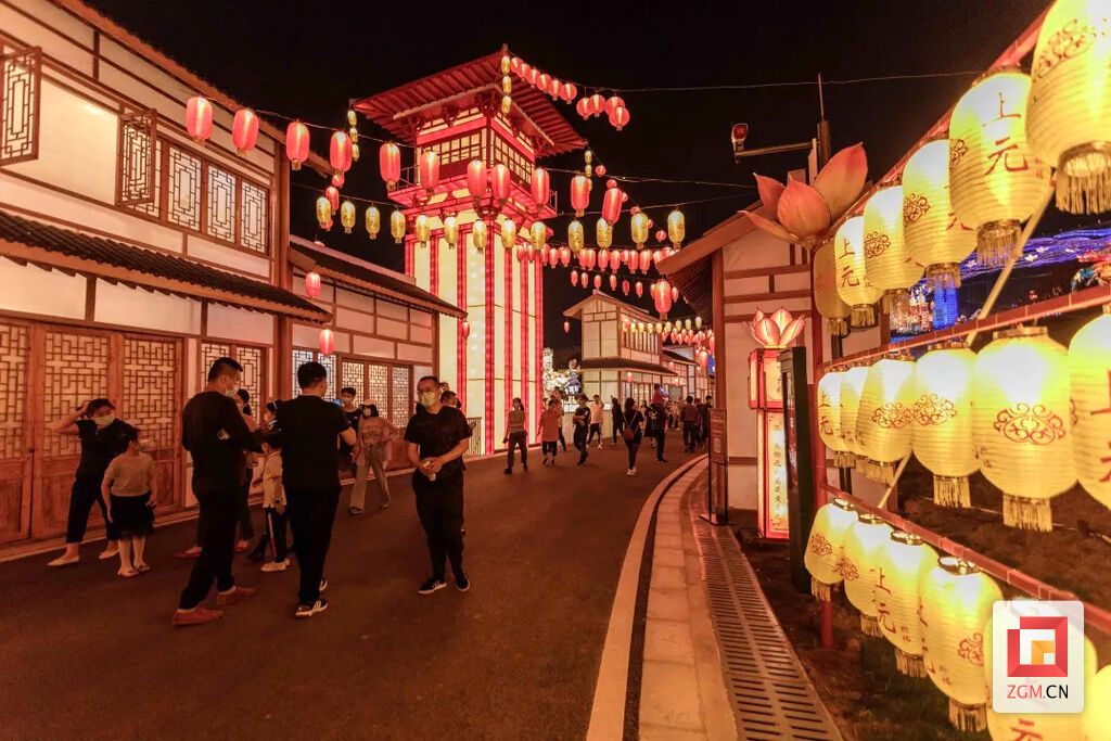 沿街一排排古色古香的民俗店铺厢房,张灯结彩,呈现出浓浓的节日气氛,门眉窗框处垂吊着大红大紫或圆圆的或方方的工艺灯、彩绸灯,过道上点缀着大大小小的人物灯、动物灯、瓜果灯。不仅仅是好看,还能在此买到来自川渝两地的扶贫产品,让游客能一边逛灯会一边参与消费扶贫行动。