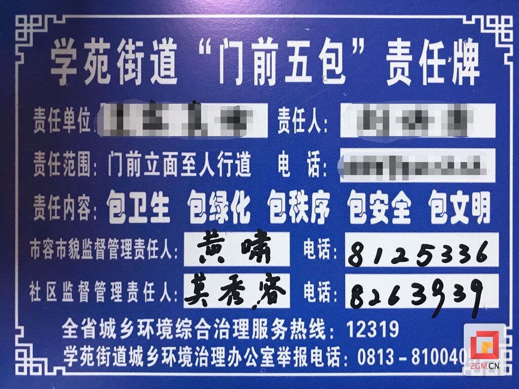 据悉,“门前五包”责任牌印制有责任单位名称、责任人姓名、责任范围、责任内容、联系电话、监督责任人及监督电话等,明确市容市貌管理责任人、社区监督管理负责人,落实“门前五包”责任制,确保市容市貌整洁有序。