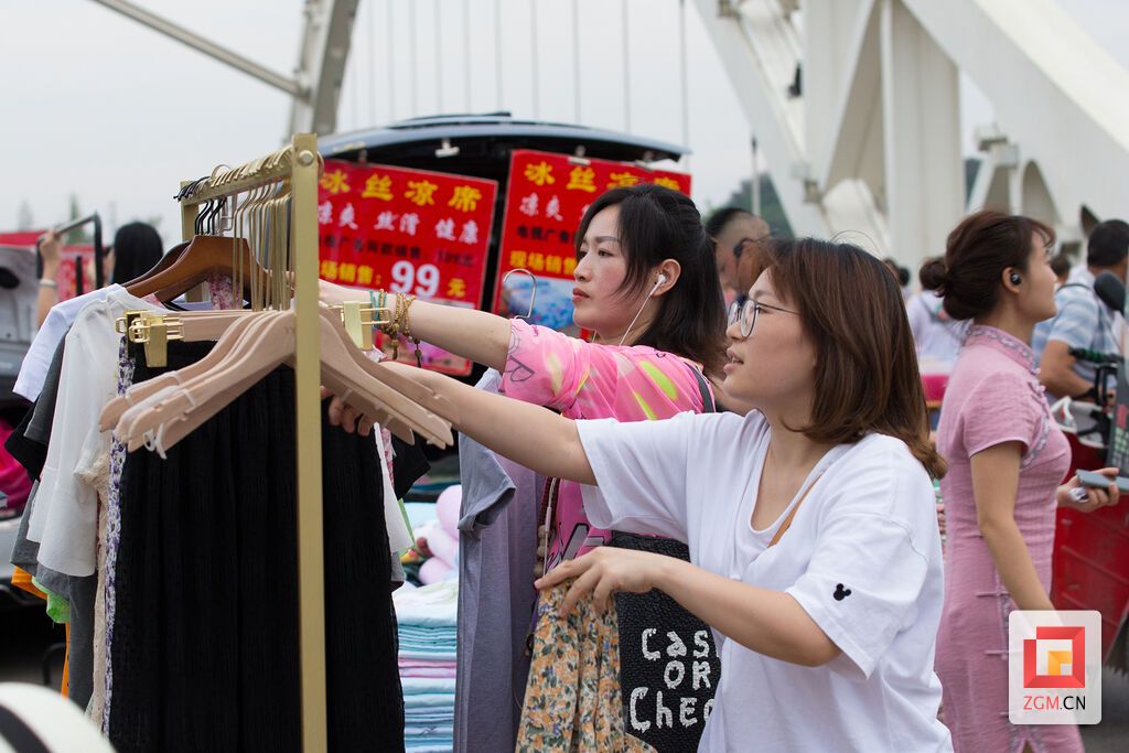 6月6日18点30分,27岁的宋夕扛着三大袋夏季女装来到桥上,找空地,支摊位。“衬衣30元一件,牛仔裤50元两条。”将服装全部挂出后,她来不及擦去额头上的汗珠,“扯开”嗓子叫卖起来,清脆的声音吸引了不少市民上前挑选。