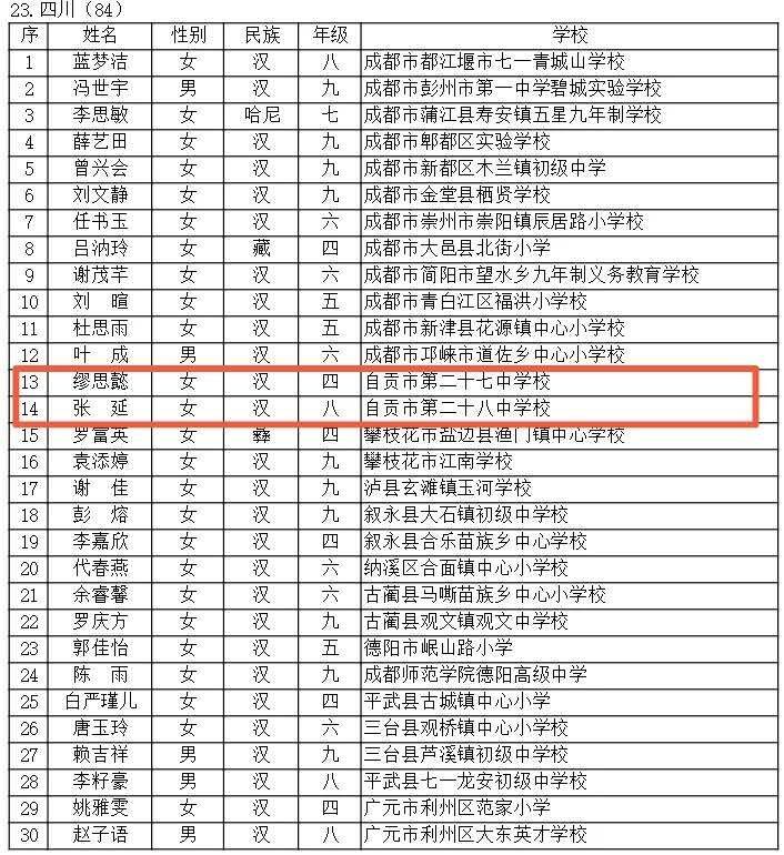 自贡网讯(记者 陈翠)6月19日,教育部、中国福利会和中国宋庆龄基金会联合发文公布第十四届宋庆龄奖学金获奖名单,此次宋庆龄奖学金共奖励1538名优秀学生,其中,四川共有84人脱颖而出成功入选。我市第二十七中学校四年级缪思懿同学、第二十八中学校八年级张延同学获奖。