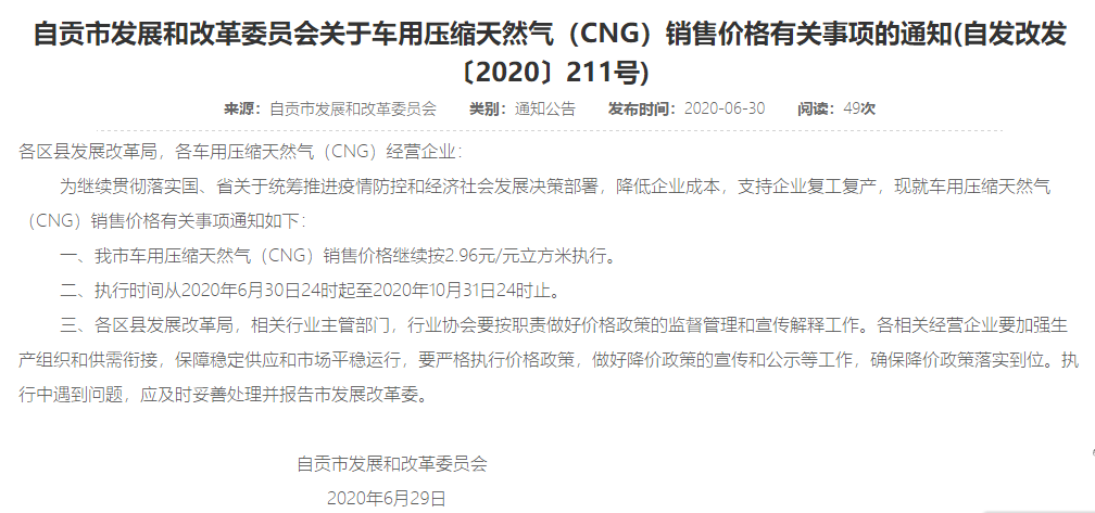 6月29日,自贡市发展和改革委员会发布了关于车用压缩天然气(CNG)销售价格有关事项的通知。通知中称,为继续贯彻落实国、省关于统筹推进疫情防控和经济社会发展决策部署,降低企业成本,支持企业复工复产,我市车用压缩天然气(CNG)销售价格继续按2.96元/元立方米执行。执行时间从2020年6月30日24时起至2020年10月31日24时止。