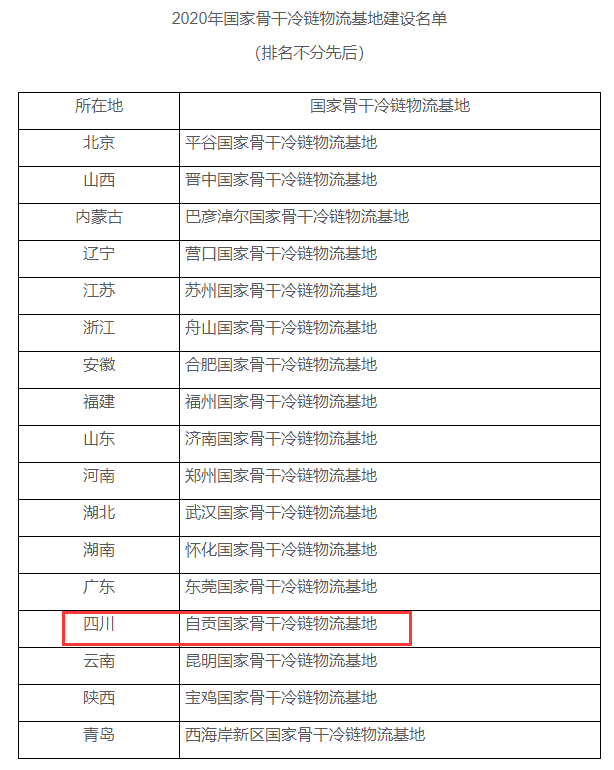自贡网讯(记者 欧亚非)7月7日,国家发展改革委发布2020年国家骨干冷链物流基地建设名单,全国17地入选。自贡作为四川省唯一,成功入列建设名单。