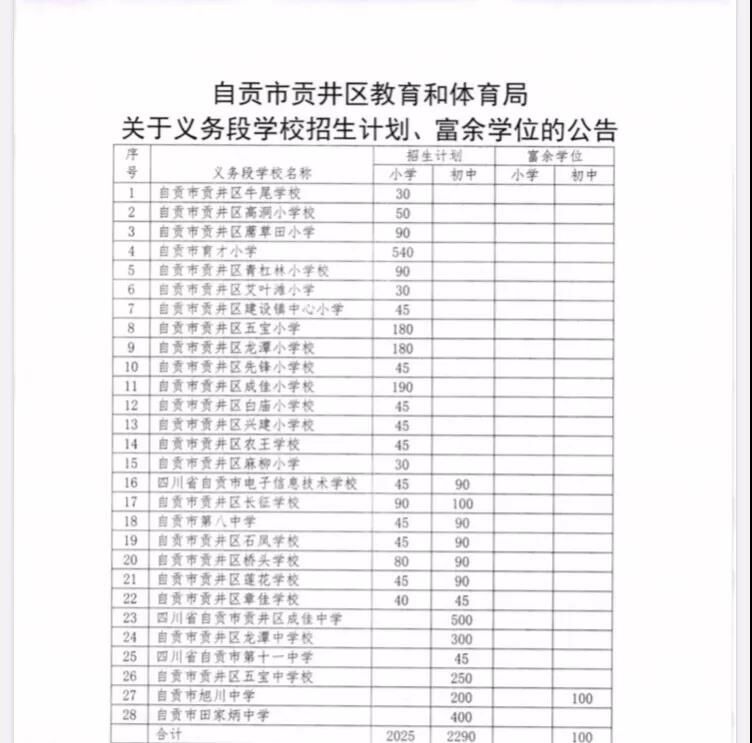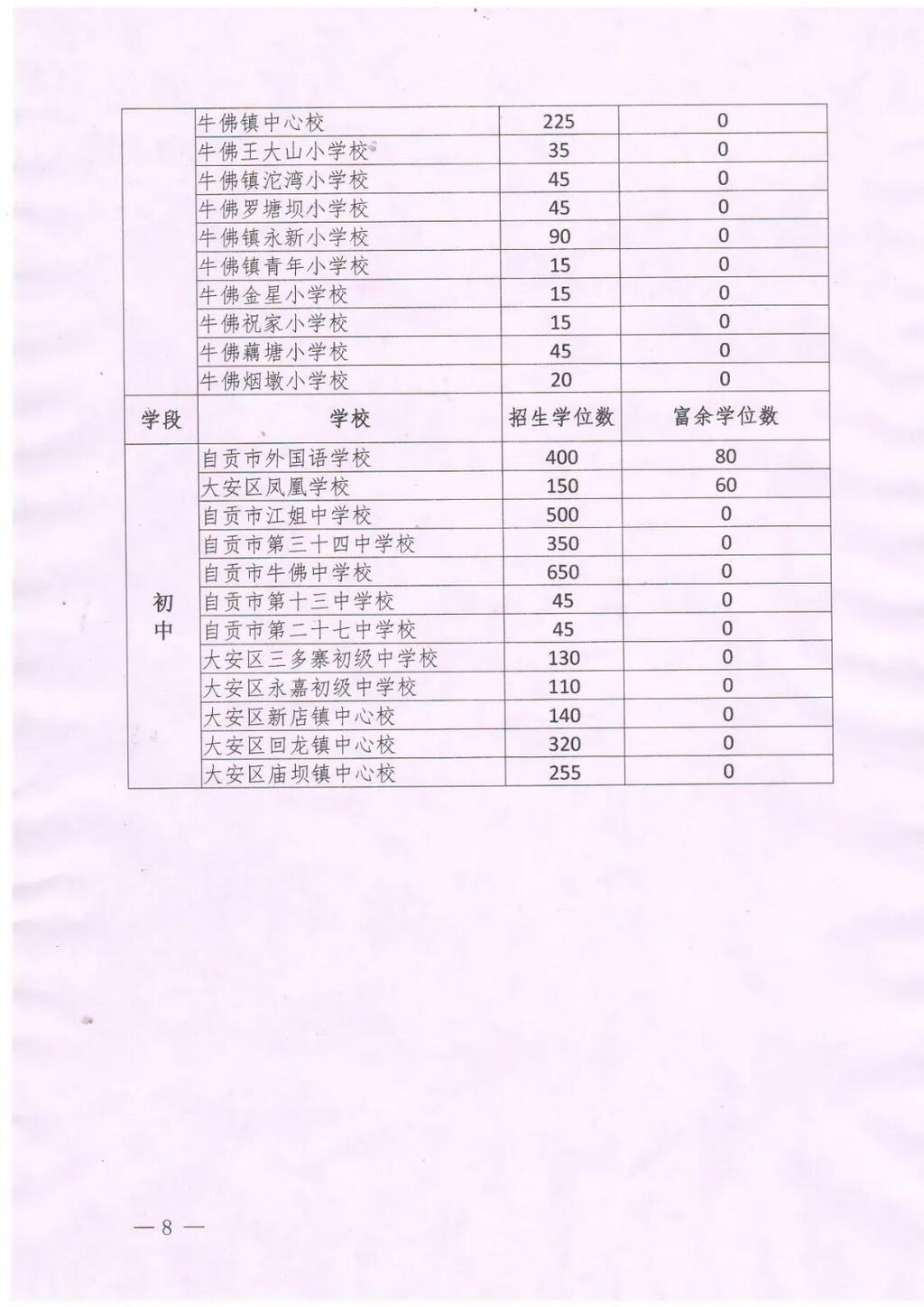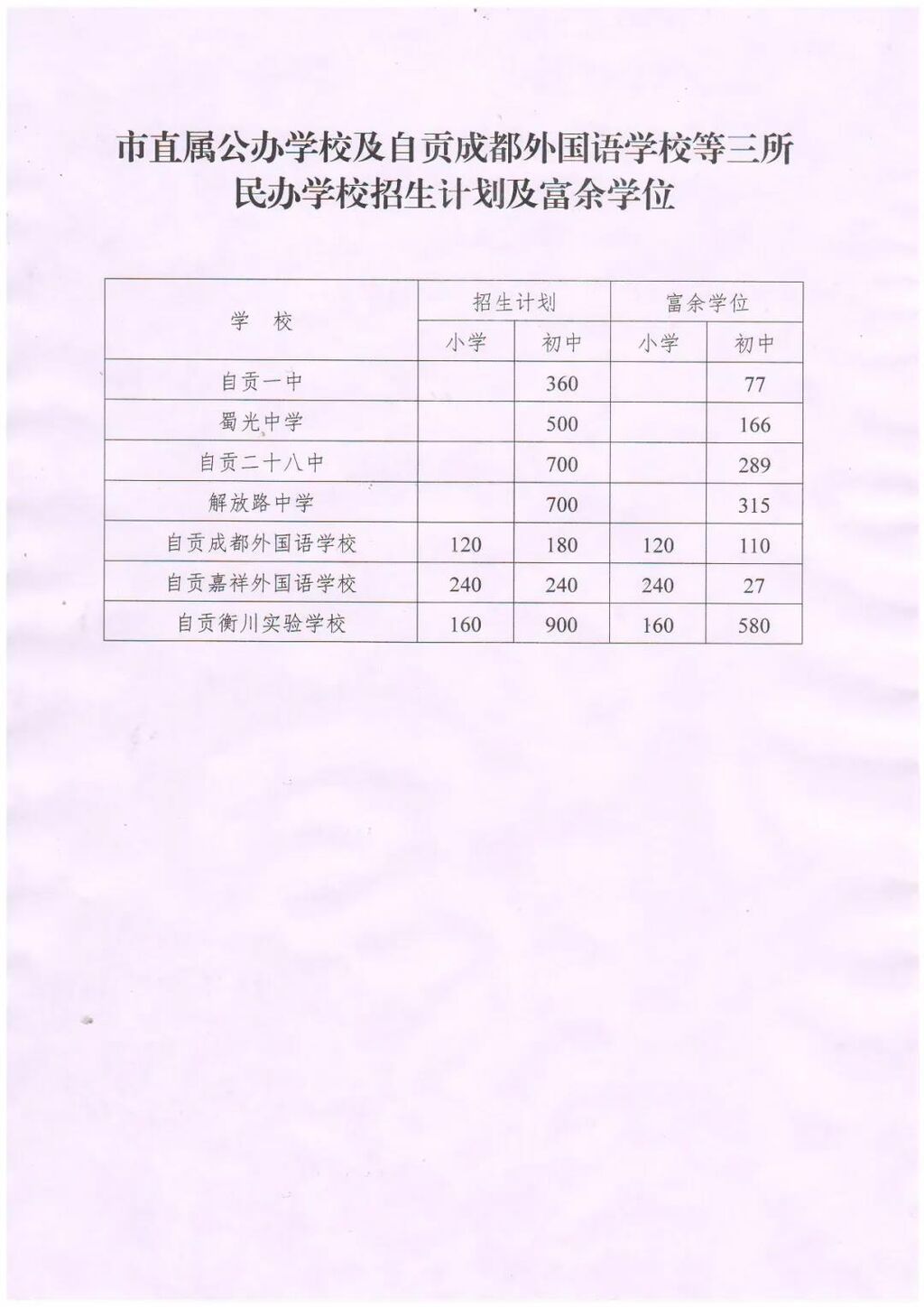 自流井区、贡井区、大安区、沿滩区和高新区户籍范围内的适龄儿童可在五区范围内申请一所有富余学位的公办小学,小学毕业生可在市直属学校(自贡一中、蜀光中学、自贡二十八中、解放路中学)或本区范围申请一所有富余学位的公办初中;荣县、富顺户籍适龄儿童和小学毕业生可在本县范围内申请一所有富余学位的公办学校;市外户籍适龄儿童和小学毕业生可在全市范围内任意申请一所有富余学位的公办学校。公办富余学位和民办学位不能同时申请。