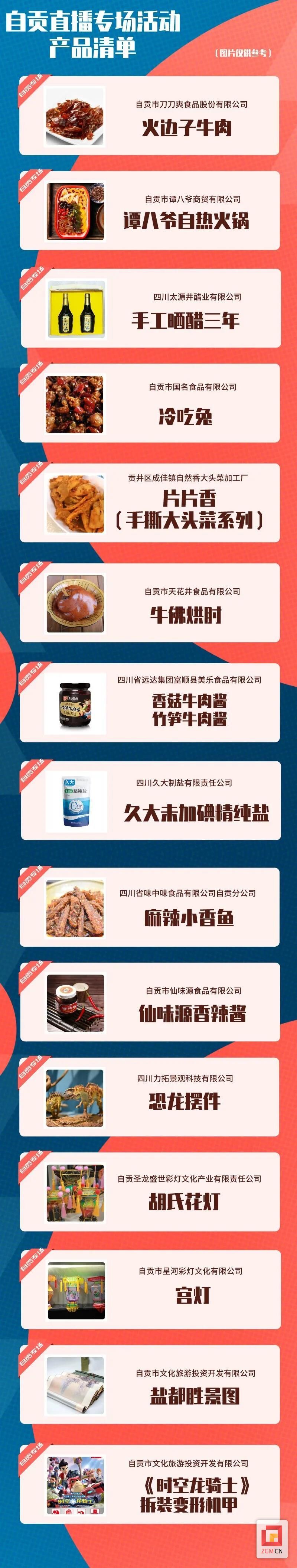 记者了解到,我市此次直播专场活动带来的产品包括自贡彩灯、织锦卷轴、时空龙骑士玩偶等特色工艺品,也涵盖了未加碘精纯盐、手撕大头菜、火边子牛肉、牛佛烘肘等特色美食……