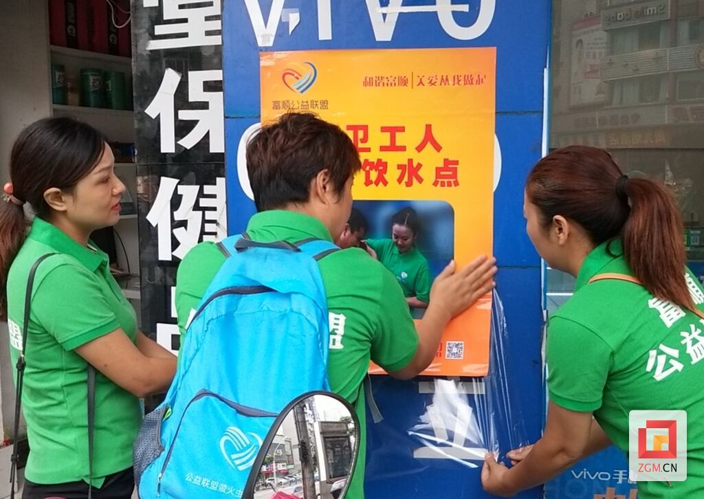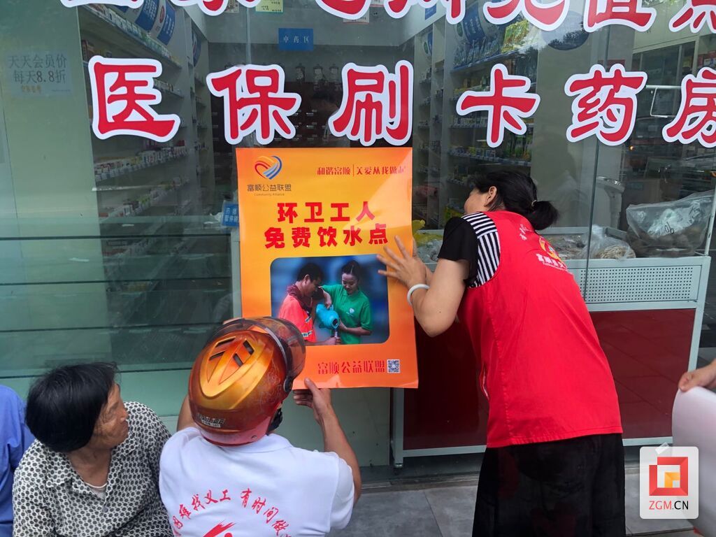 自贡网讯(记者 郑鑫玉)7月21日下午,富顺公益联盟开展环卫工人免费饮水点宣传及海报张贴公益活动,近百名志愿者在富顺城区各主次干道、背街小巷,宣传环卫工人免费饮水点、张贴免费饮水点海报,呼吁社会关注环卫工人。