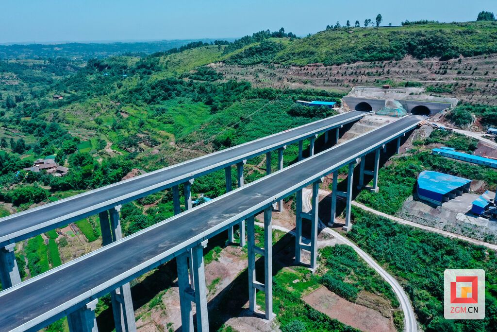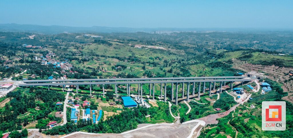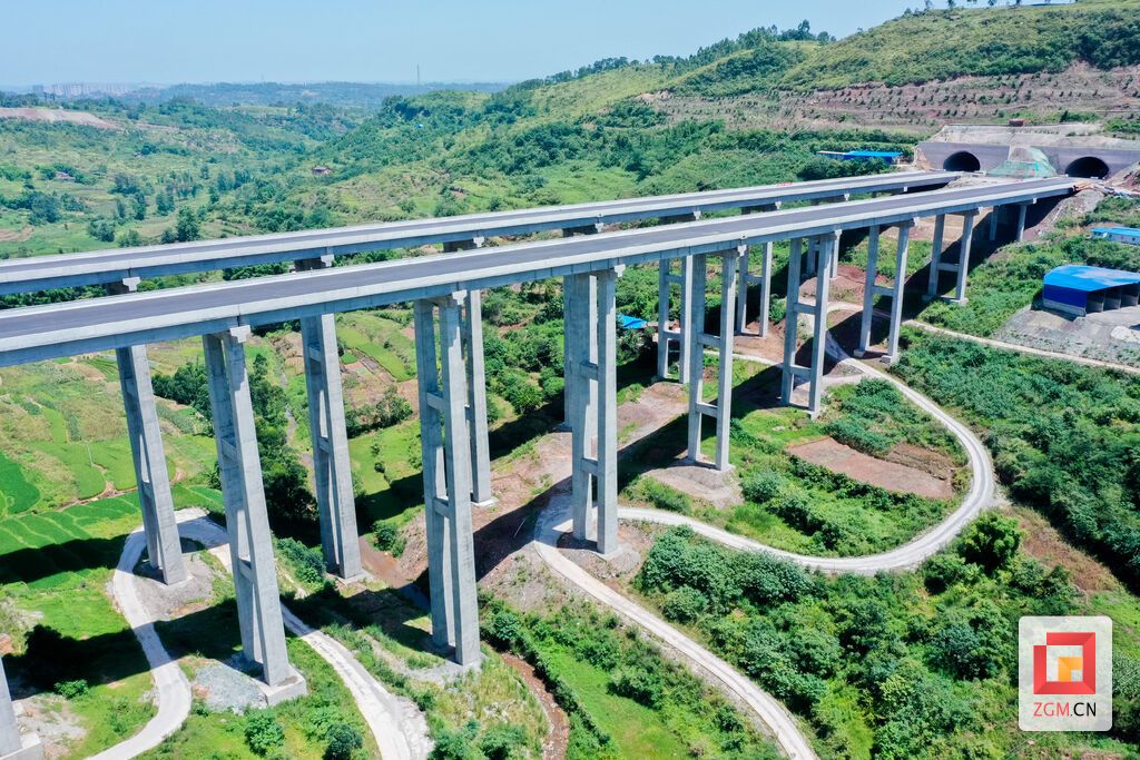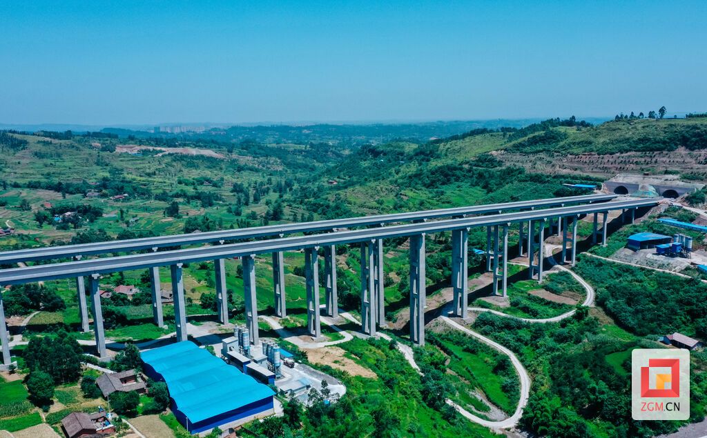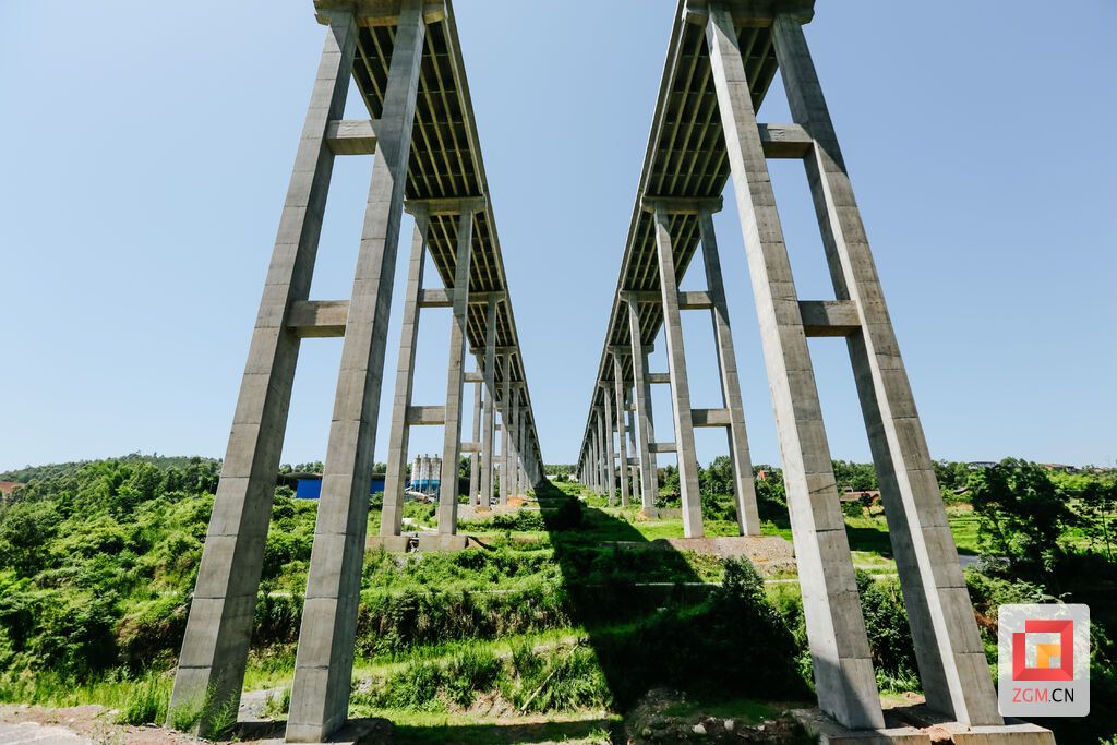 图:被设计为分离式桥梁的五皇坝大桥,总长769米,宽度17米,最大桥墩高度76米,连接大树坳隧道和大沟头隧道,目前已基本竣工。