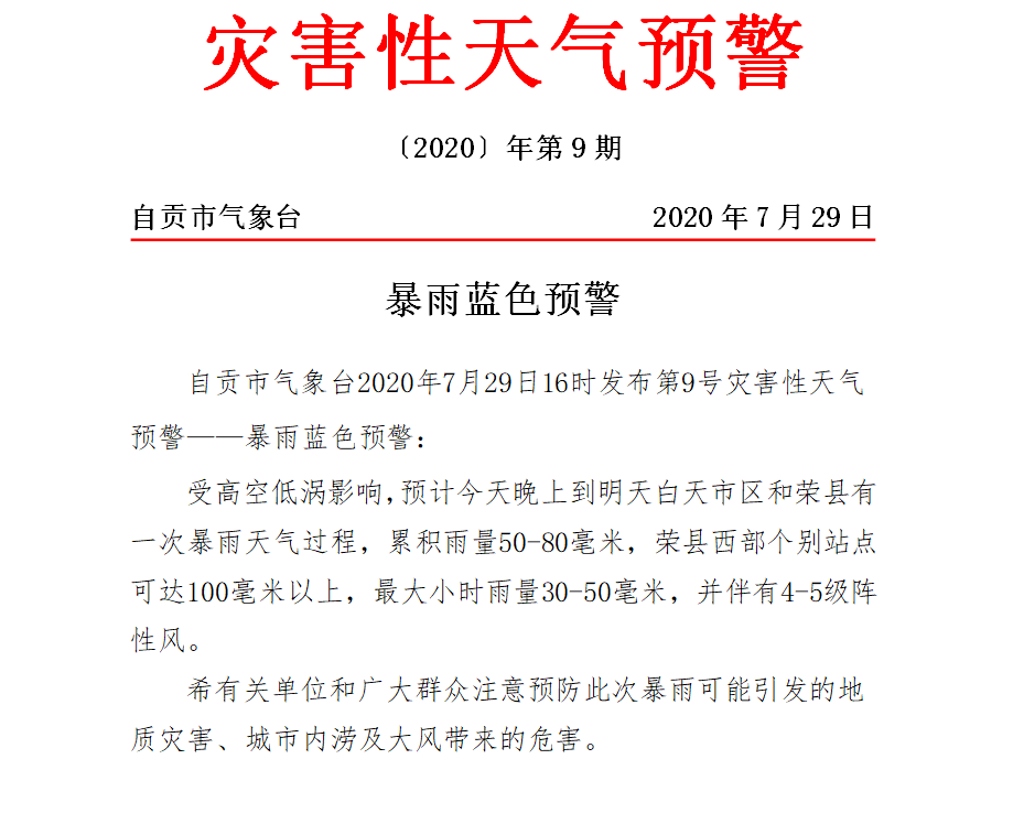 自贡市气象台7月29日16时发布第9号灾害性天气预警——暴雨蓝色预警:受高空低涡影响,预计今(29日)天晚上到明(30日)天白天市区和荣县有一次暴雨天气过程,累积雨量50-80毫米,荣县西部个别站点可达100毫米以上,最大小时雨量30-50毫米,并伴有4-5级阵性风。