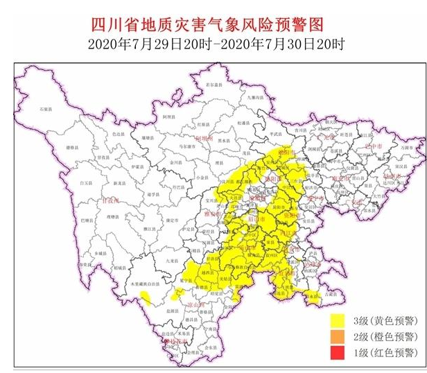 7月29日,四川省地质灾害指挥部办公室发布全省地质灾害气象风险预警。结合四川省气象台天气预报情况,7月29日20时~7月30日20时,预警区域较前一天有所扩大,其中绵阳、德阳、眉山、乐山、宜宾、自贡、资阳7市全域进入预警范围,成都、泸州、内江、雅安、阿坝、凉山部分县(市、区)进入预警范围。