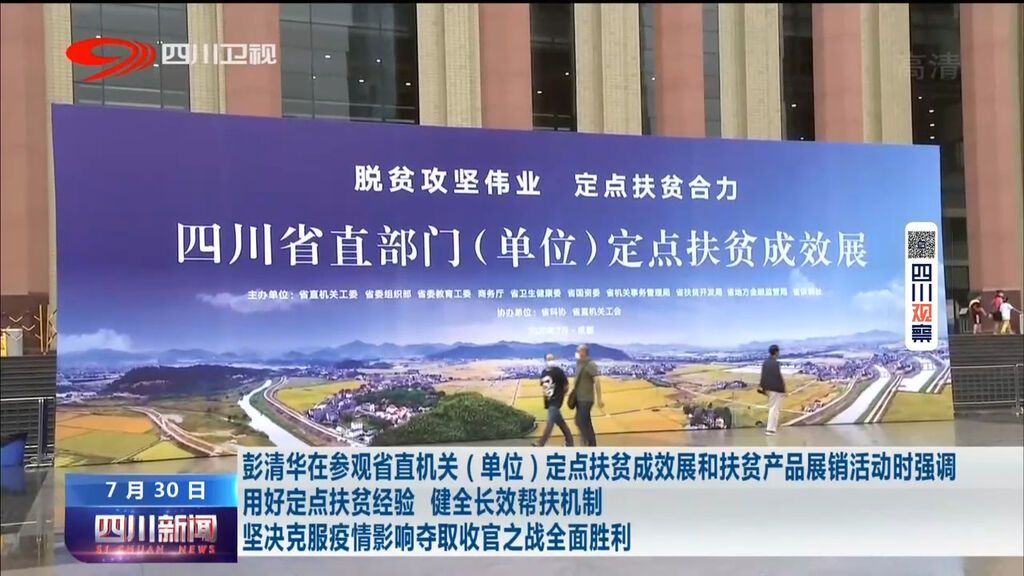 发展产业是实现长效脱贫的根本之策。展览现场同步举办了扶贫产品展销活动,来自定点帮扶县的上千种产品参展。彭清华步行至展销区,详细询问了解常态化疫情防控条件下扶贫农畜牧产品的种养、加工、销售等情况。他指出,努力克服疫情影响,解决好农副产品滞销卖难问题,对于发展壮大贫困地区特色产业、带动群众持续稳定增收意义重大。要强化产销对接,用好“四川扶贫”公益性集体标标识,深入开展消费扶贫行动,推动产品进商超、进社区、进食堂、进深加工企业,运用直播带货等新模式做好电商平台,线上线下并举拓宽销售渠道,确保贫困地区产业持续健康发展。