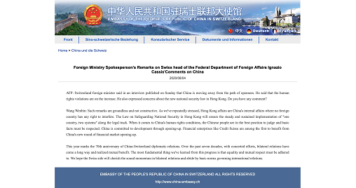 当地时间8月4日,中国驻瑞士联邦大使馆在其官网援引中国外交部发言人的表态,对瑞士联邦委员兼外长卡西斯日前在接受《周日一瞥报》采访中称,中国正在偏离开放道路,侵犯人权的情况在增加,并对香港国安法表达了“关切”进行回应。