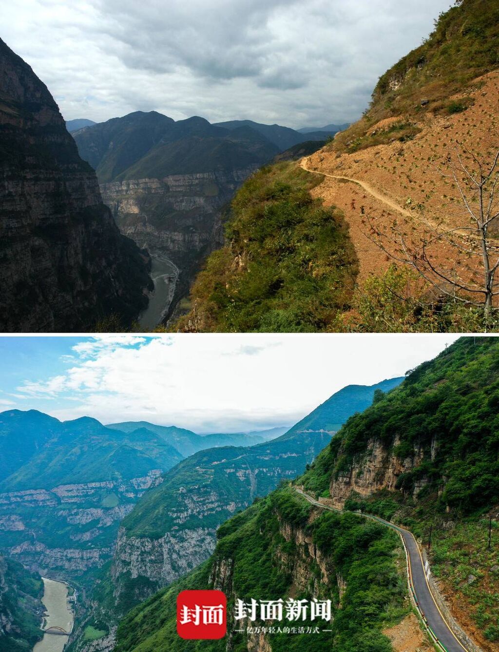 2018年,古路村第一条公路建成,村民出行更方便。(上图摄于2005年,下图摄于2020年)