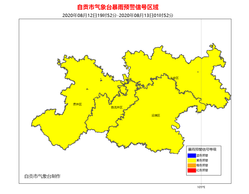 自贡网讯(记者 熊丹)8月12日19时52分,自贡市气象台发布第20号暴雨黄色预警信号:目前荣县西部、大安区和沿滩区有降雨回波生成发展,预计自流井区、贡井区、大安区、沿滩区6小时降雨量将达50毫米以上,并伴有雷电和短时阵性大风。