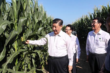 2020年7月22日至24日,中共中央总书记、国家主席、中央军委主席习近平在吉林省考察。这是7月22日下午,在四平市梨树县国家百万亩绿色食品原料(玉米)标准化生产基地核心示范区地块,习近平走进玉米地,察看玉米长势。 新华社记者 王晔摄
