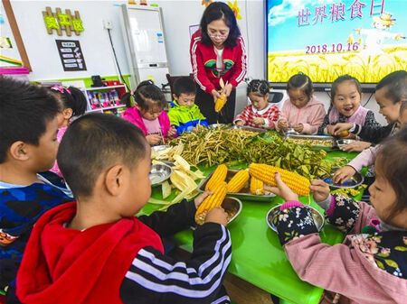 2018年10月16日,河北省大厂回族自治县城区第三幼儿园组织开展了“爱惜粮食 从小做起”主题教育活动。 新华社记者 李晓果摄