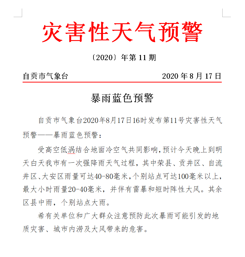 自贡市气象台2020年8月17日16时发布第11号灾害性天气预警——暴雨蓝色预警: