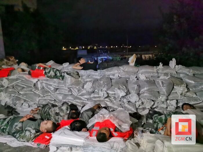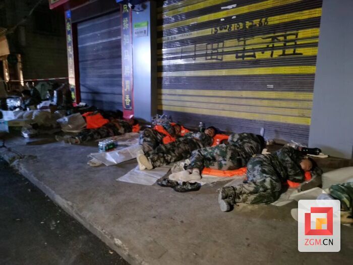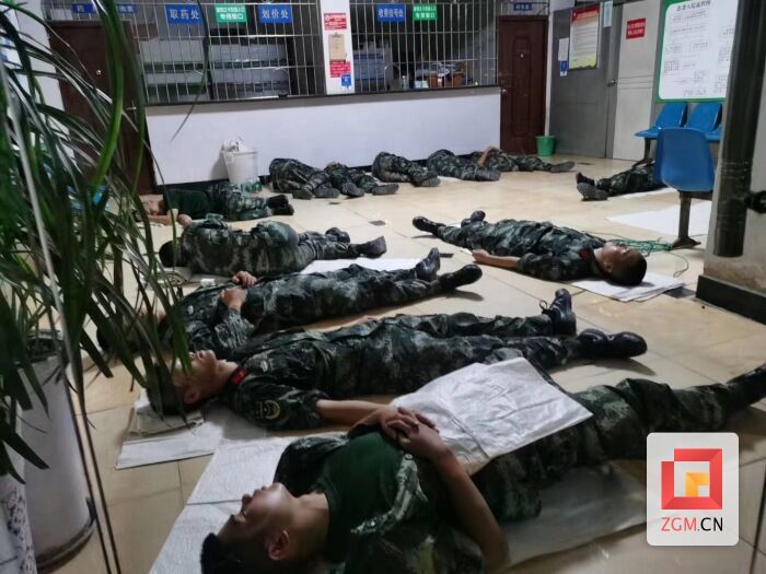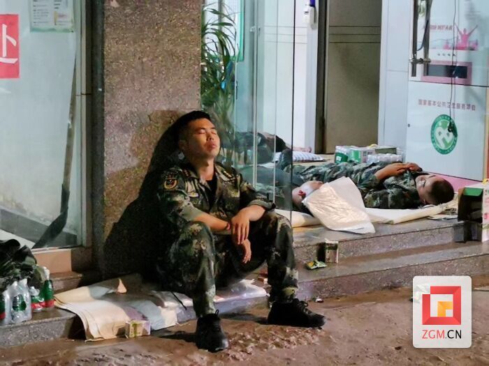 8月18日早上6时左右,在富顺文庙广场附近,连续奋战了9个小时的官兵们,就地休息。(记者 欧亚非)