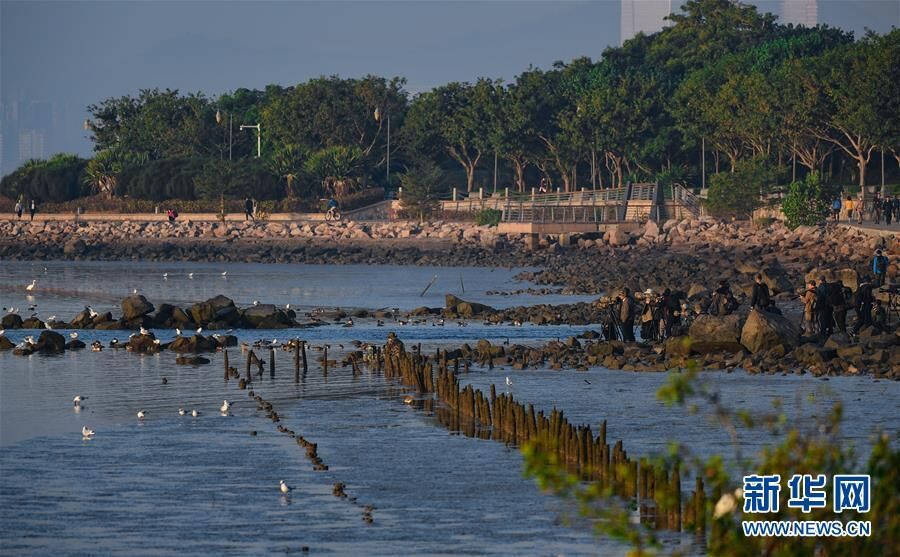 在深圳市南山区深圳湾公园,市民在海边拍摄水鸟(2019年12月11日摄)。新华社记者 毛思倩 摄