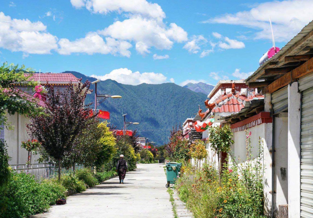 宽阔平坦的街道旁林立着一栋栋独门独院的二层小楼,家家户户门前院内鲜花盛开,很难想象这里是西藏的农村。