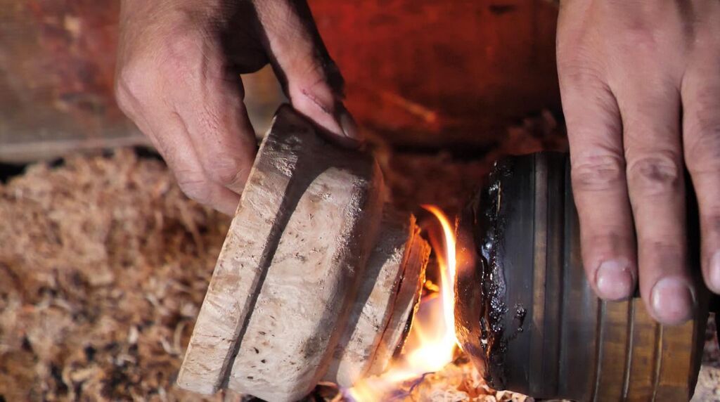 门巴木碗的制作,要经历5道工序。木碗制作的原料,是硬木的树根及树瘤。原料的大小决定了制作的木碗大小。木料坯子先经过粗加工被雕刻成粗坯,之后再反复经历晾干和水煮。要煮三次,一次要煮3-4个小时,不然用的时候容易开裂。接下来的步骤就是精制。主要的工具是长条形的刻刀。刻刀是木制长把,下端是铁制的刀头。不同形制、厚薄、宽窄的刀头用来制作不同的木碗。扎西巴珠一边为我们演示一边介绍:“工具我们自己做嘛,其他人做不来这个。”最后一道工序是上色。门巴木碗的上色不用工业生产出的油漆,而是选用当地一种特殊植物的果实。这种纯天然的原材料,不会对人体造成任何伤害。上色,晾干,反复多次。经过这重重辛苦,一个美观耐用的木碗才最终完成。