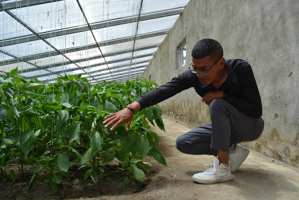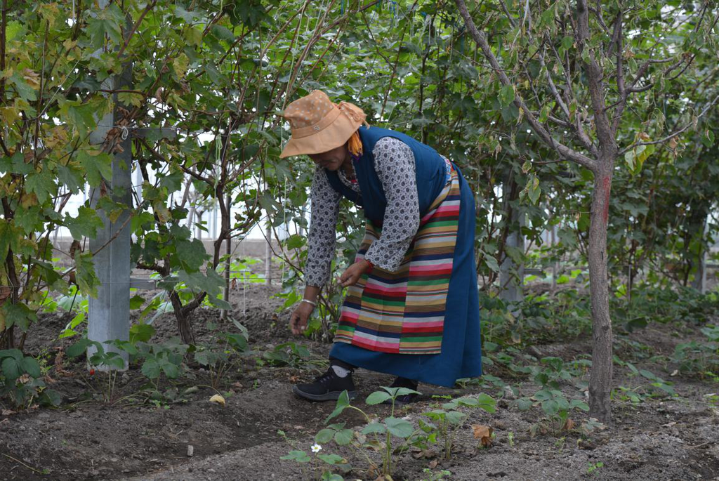 贫困群众索朗普赤正在大棚里给蔬菜除草。