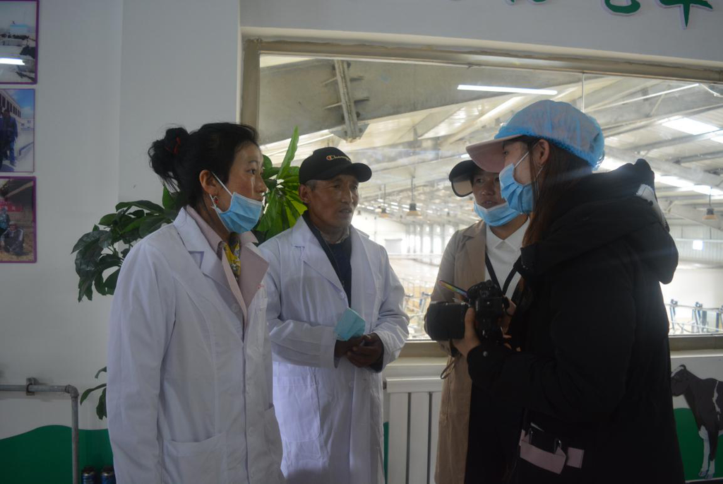 奶牛养殖基地里,曾经的贫困群众正在接受记者采访。