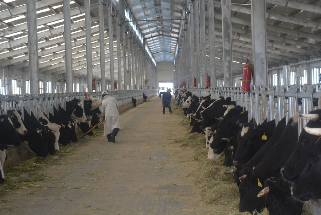 成群的黑白花奶牛被分圈在两排牛栏里,喂养工人正按程序给牛添加饲料;精料加工间,刚刚参加工作的大学生正在利用无土栽培技术给奶牛培养豌豆、青稞等饲料。机械化挤奶以及奶质检测等工作都有条不紊地进行着。