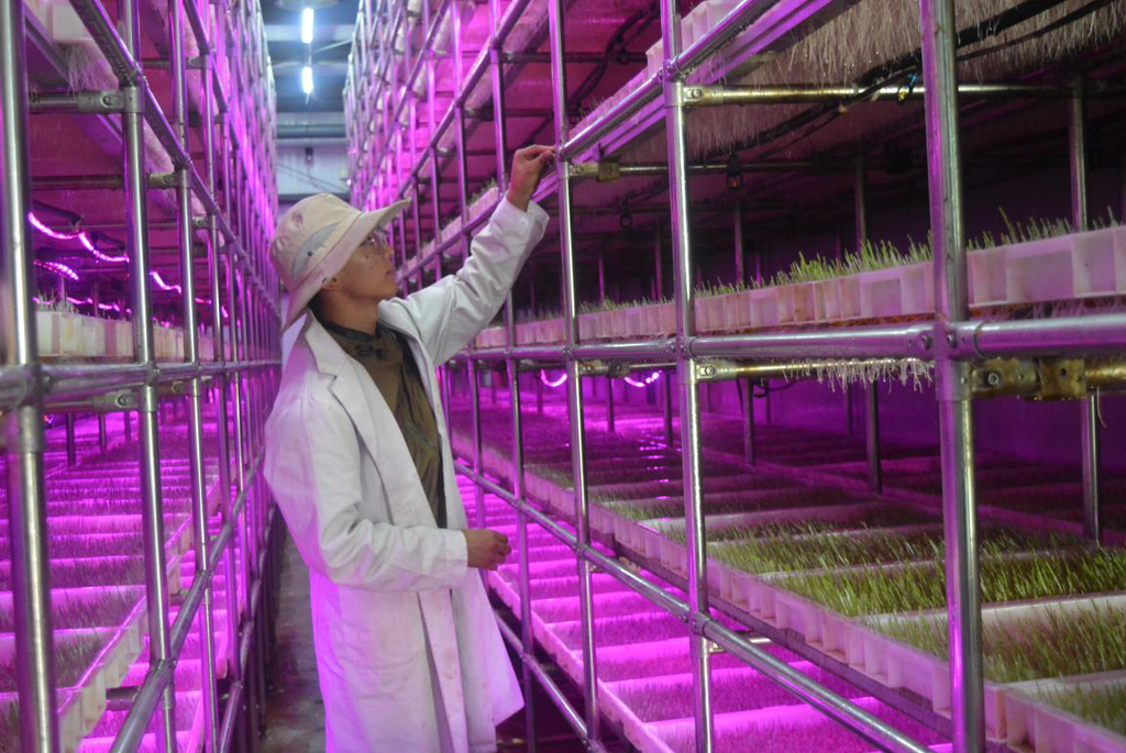 大学生正在用无土栽培技术给奶牛培育豌豆、青稞等饲料。