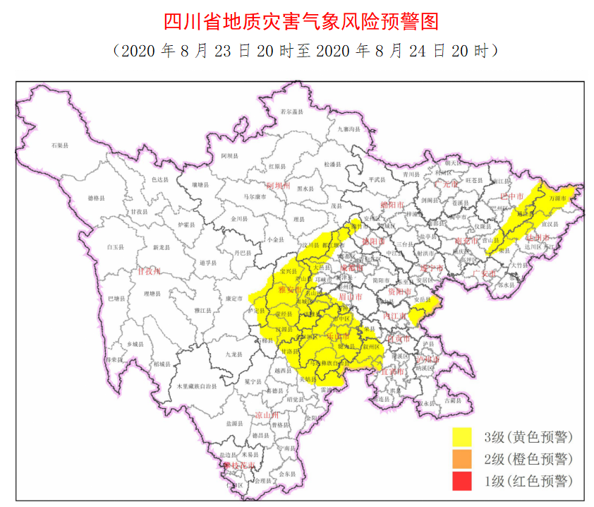 8月23日,四川省地质灾害指挥部办公室发布全省地质灾害气象风险预警。结合四川省气象台天气预报情况,8月23日20时~8月24日20时,全省地质灾害气象风险预警结果如下: