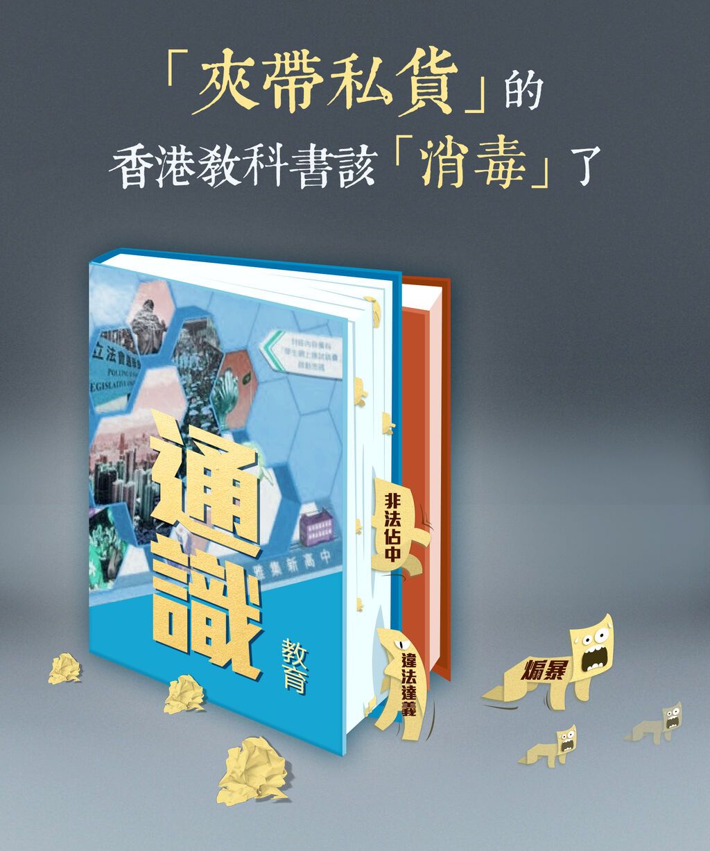 翻开这些通识课教材不难发现,预设立场和煽动性内容充斥其中。比如刻意放大香港与内地的矛盾,把“驱赶内地游客”等不当行为称为“战斗”,抹黑香港空气污染是因为“内地空气污染物随季风吹到香港”;又如鼓吹暴力违法,宣扬所谓“公民抗命”,鼓动学生用暴力等激进手段表达诉求;再如撕裂国民身份认同,故意将“香港人”与“中国人”对立起来,甚至刊登“《基本法》没有写行政长官要爱国”等令人错愕的谬论。