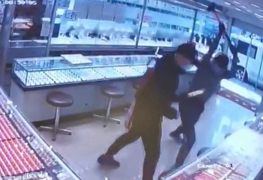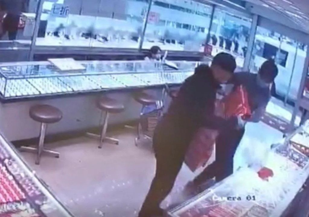 25日9时许,两名身穿黑衣、头戴鸭舌帽的男子,分别手持铁锤和牛肉刀进入金行。在砸毁玻璃柜台、抢走2至4盘金饰后,乘私家车逃去。