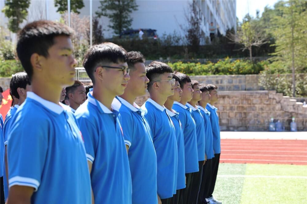 在另一所安置点学校晴隆县第三中学,高一年级的新生正在军训。军训场地是一个标准的足球场,翠绿的人造草皮、规整的塑胶跑道,孩子们衣着整齐,动作统一,充满朝气。