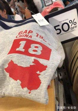 ——2018年,有网友在Gap店内拍下的一款T恤照片。在左胸靠近心脏位置印制的中国地图上,藏南、阿克赛钦、台湾、南海地区均被抹去。当晚,Gap就通过其官方微博致歉,并表示涉事T恤系在“个别海外市场”发售,现该款产品已从中国市场撤回并全部销毁。