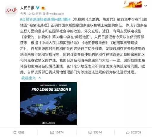 ——2019年的热播电视剧《亲爱的热爱的》中因出现了不包含台湾、海南岛和阿克赛钦等地区的中国地图画面,遭到网友质疑。事后,剧组连夜修改错误,有关部门对其进行处罚,导演、主演也纷纷微博表态“中国一点也不能少”。