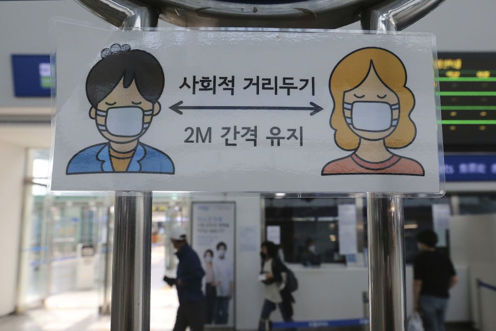 这是8月18日在韩国首尔火车站拍摄的提醒人们保持社交距离的标牌。(新华社/美联)