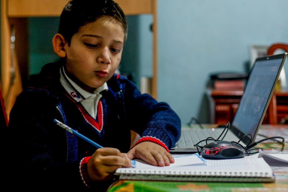 8月24日,在墨西哥墨西哥州,7岁的塞萨尔·巴斯克斯在电脑前上课。墨西哥学校的2020-2021学年于当日开学,受疫情影响,目前课程基本以在线方式进行。(新华社发)
