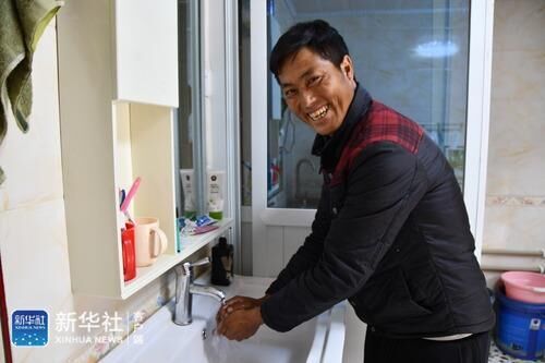 ↑彭措在改建的卫生间内洗手(7月28日摄)。新华社记者 周相吉 摄