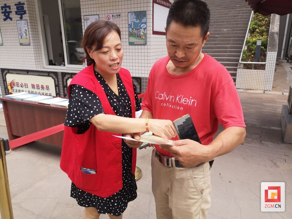 “你好,这是‘创文’宣传资料,麻烦了解一下。”当天上午10点,烈日当空。在金帝花苑小区,志愿者铁烈平身穿红色马甲,正在向过往居民发放“创文”宣传资料,她的额头上已经冒出豆大的汗珠。