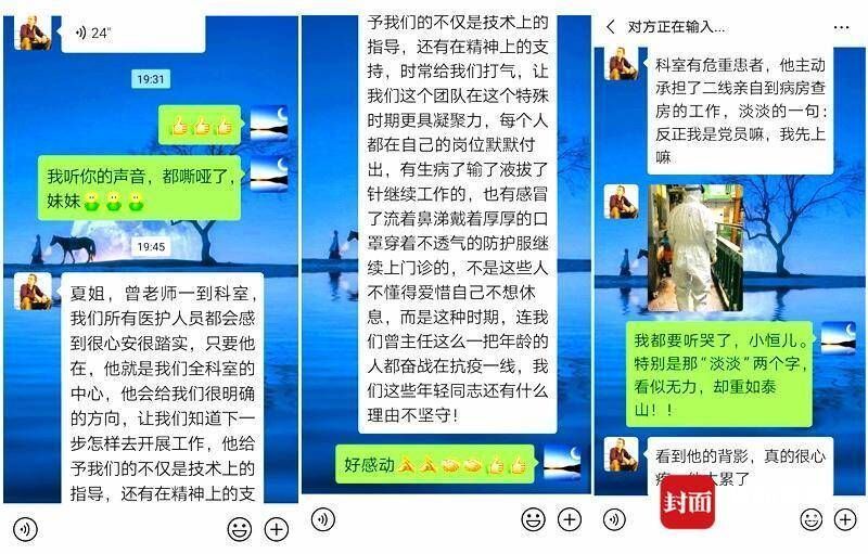 一名77岁高龄的新冠肺炎重型患者,基础疾病多,病情重,开始不太配合治疗,曾跃每天查房时都会与他谈心沟通,增强其战胜疾病的信心。最终该患者痊愈出院,出院后多次联系曾跃表达深深谢意,并要求一睹曾跃的“真容”;一名50多岁的新冠肺炎重型患者,住院期间精神焦虑紧张,曾跃每日查房都会对她进行安慰交流,该患者治愈出院时不停地向曾跃鞠躬致谢,并热泪盈眶地说:“如果我的血浆可以治病,我会随时积极主动提供!”