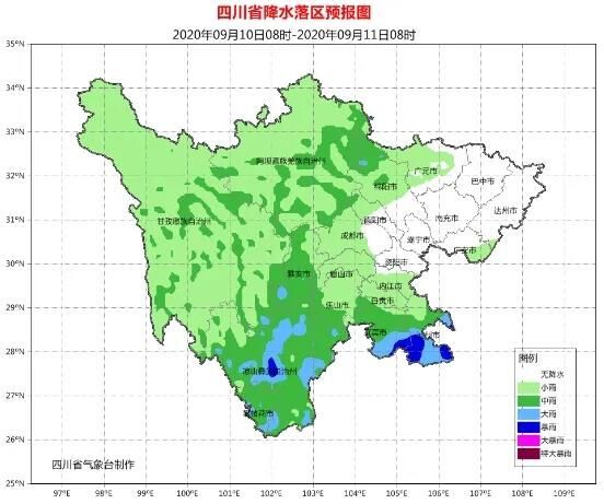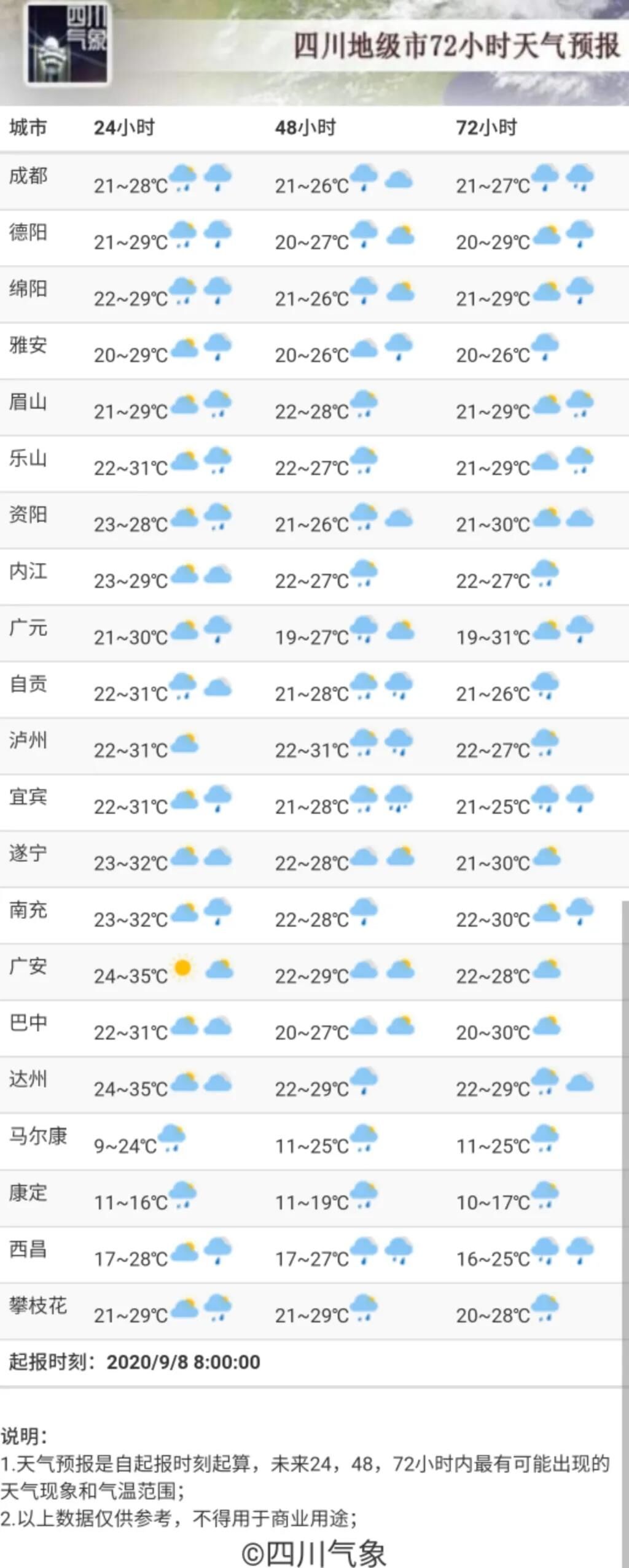 9月10日白天到晚上,雅安、乐山、眉山、资阳、内江、自贡、宜宾、泸州8市及广元、绵阳、德阳、成都4市西部阴天有阵雨,其中雅安、乐山、宜宾、泸州4市有中雨,宜宾、泸州2市南部有大雨到暴雨,盆地其余地方阴天间多云;川西高原阴天间多云有阵雨或雷雨,局部中雨;攀西地区阴天有中雨,局部地方大雨到暴雨。