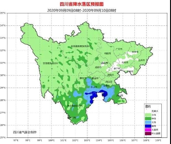 9月9日白天到晚上,盆地大部地方阴天有阵雨,雅安、乐山、眉山、宜宾、自贡、泸州6市有中到大雨,其中乐山、宜宾2市局部暴雨。川西高原阴天间多云有阵雨或雷雨,局部中雨;攀西地区阴天有小到中雨,其中凉山州东北部的局部地方大雨到暴雨。