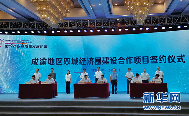 新华网重庆9月9日电(韩梦霖)9月9日,“2020线上中国国际智能产业博览会(以下简称“智博会”)齿轮产业高质量发展论坛”在綦江举行。 开幕式上,举行了成渝双城经济圈建设合作项目签约仪式,綦江区、自贡市、攀枝花市三地相关部门、企业分别签订了共建成渝地区双城经济圈产业合作示范园区项目、齿轮切削技术应用服务研究中心项目、攀钢集团与綦江齿轮产业技术创新联盟合作项目等协议。现场,还举行了重庆赛康和齿轮制造创新中心揭牌仪式,自贡市就工业投资环境进行了宣传推介。
