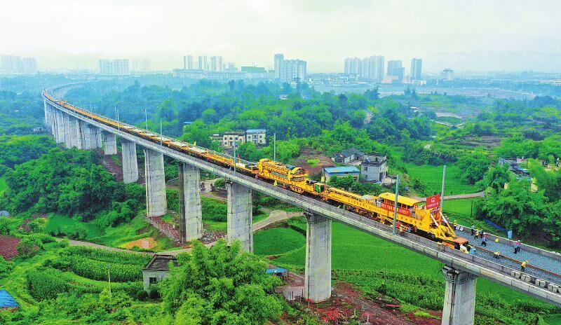 今年6月12日,随着第一组长钢轨在泸县车站2号桥落下,川南城际铁路正式开始铺轨,如今已从泸县铺设至富顺境内,累计铺设40公里,明年2月底完成长轨铺设。