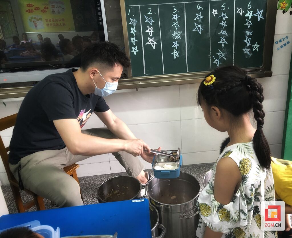 “不挑食,不浪费;文明餐,要牢记……”9月10日中午12时,伴随着“文明就餐三字歌”的校园广播,汇兴小学的学生们在各自教室门口有序排队打饭、就餐。记者在五年级1班门前看到,一名老师正在给孩子们打菜,一些孩子主动要求老师“少打一点,不够再加”。