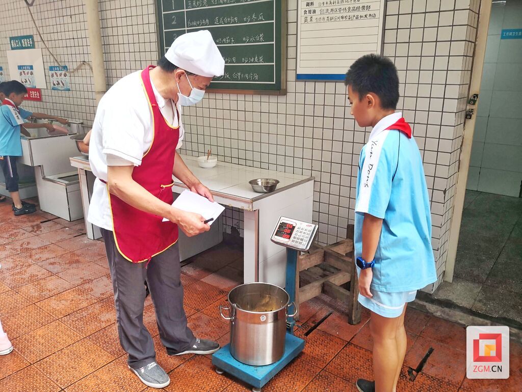 切菜、称重、调料、下锅、端菜、送菜……6名穿戴白衣、白帽、白口罩的厨师在厨房里精心制作着一道道美味可口的饭菜,厨房里干净整洁,没有垃圾和积水。以上这一幕,发生在汇兴小学的厨房里。取菜窗口并排三台电视里播放的是厨房的实时视频,可以清楚看到厨房里摆放的蔬菜是否新鲜,以及厨师做菜的每一个环节、每一道工序。