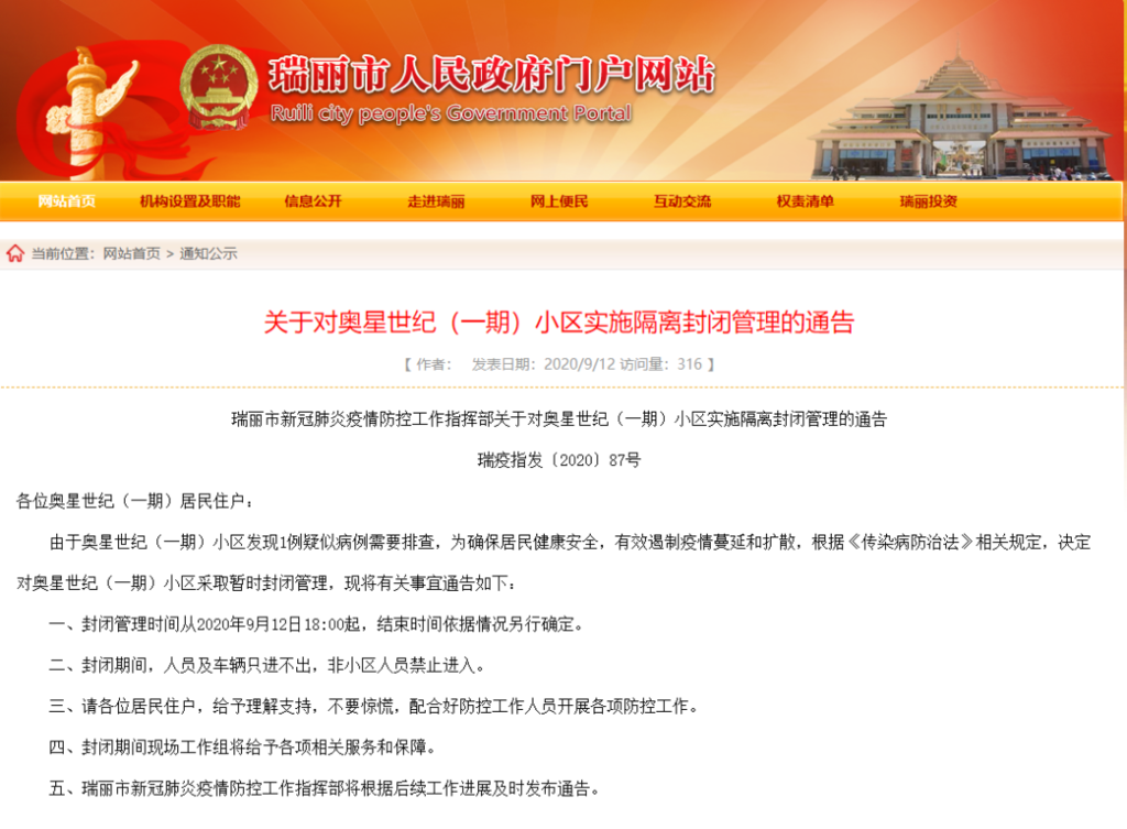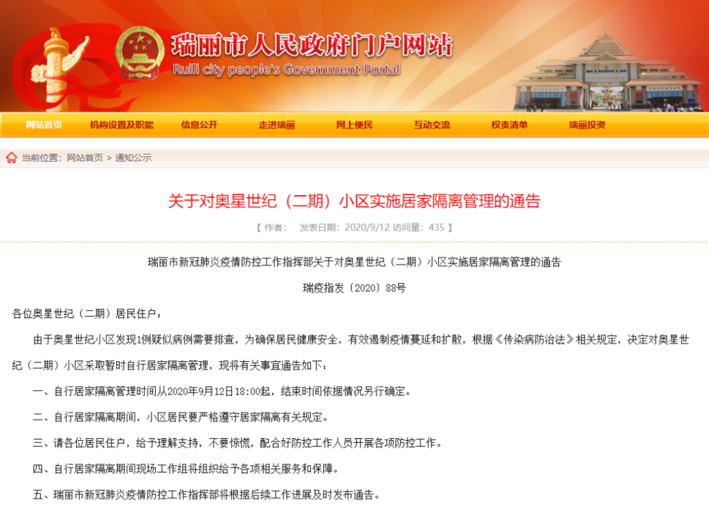 9月12日晚,云南省瑞丽市人民政府官方网站连续发布两则通告,称当地发现1例疑似病例。