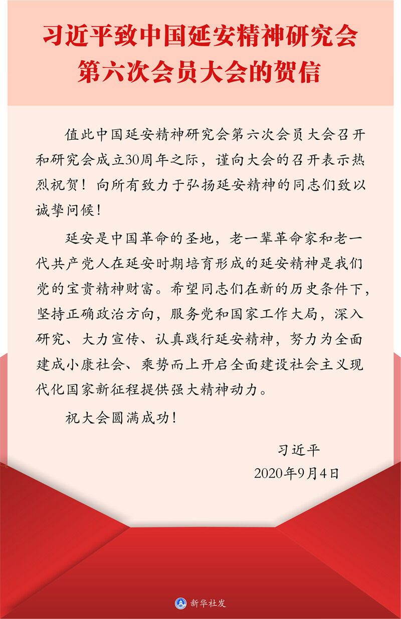 中国延安精神研究会第六次会员大会9月19日在京召开,中共中央总书记、国家主席、中央军委主席习近平发来贺信,向大会的召开和研究会成立30周年表示热烈祝贺,向所有致力于弘扬延安精神的同志们致以诚挚问候。