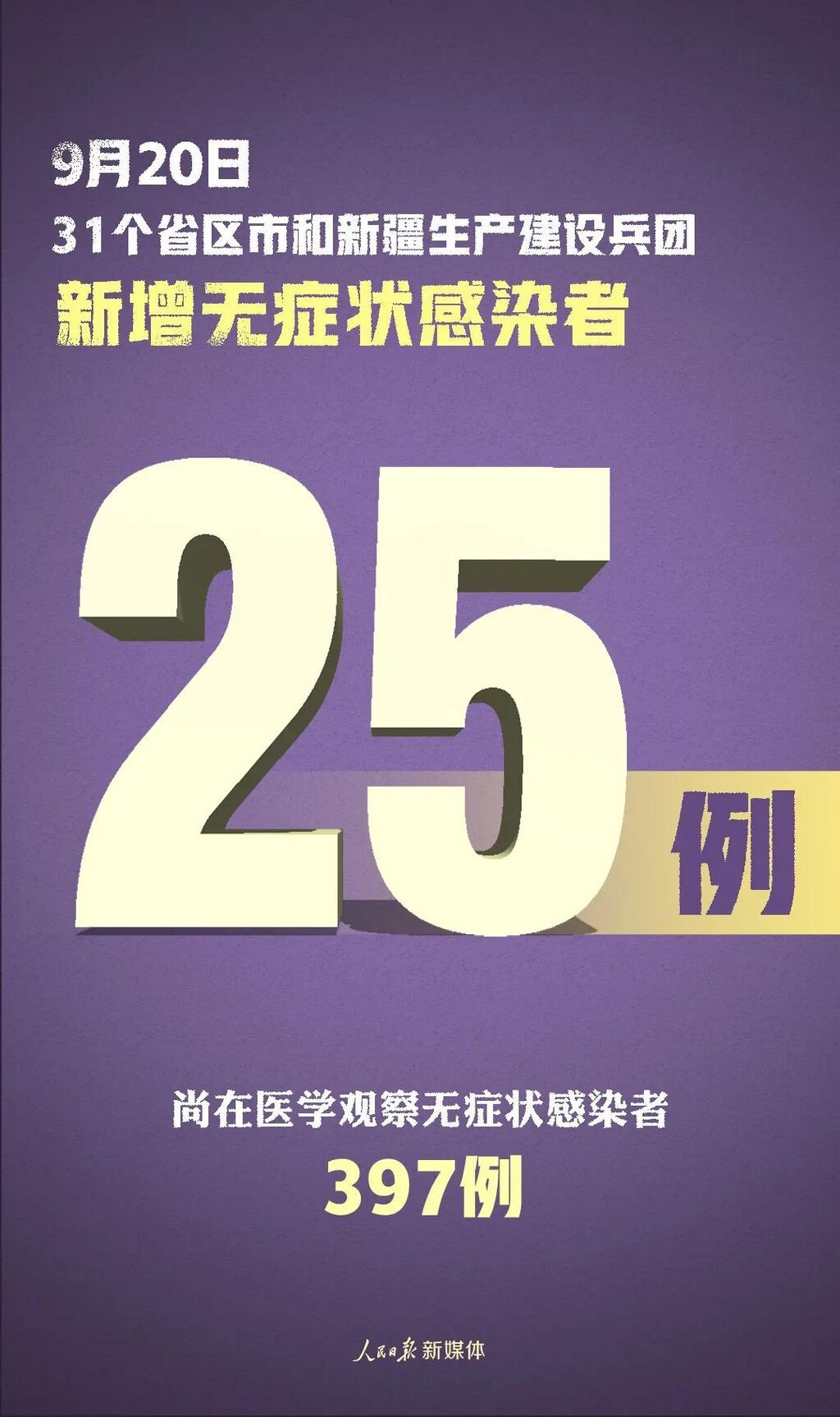 31个省(自治区、直辖市)和新疆生产建设兵团报告新增无症状感染者25例(均为境外输入);当日无转为确诊病例;当日解除医学观察10例(均为境外输入);尚在医学观察无症状感染者397例(境外输入396例)。